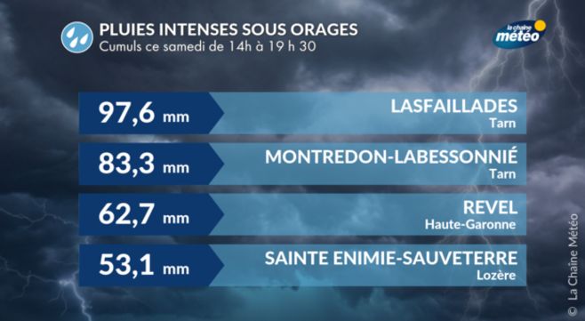 À 17 h 30, la région Midi-Pyrénées retrouve un temps plus calme après les intempéries. Dans le Tarn, il est tombé près de 100 mm d'eau à Lasfaillades de 14 à 17 h 30 En revanche, les Cévennes et le Massif central sont sous des pluies abondantes et orageuses. D'autres orages remontent de la région lyonnaise au val de Loire en traversant le Berry.
