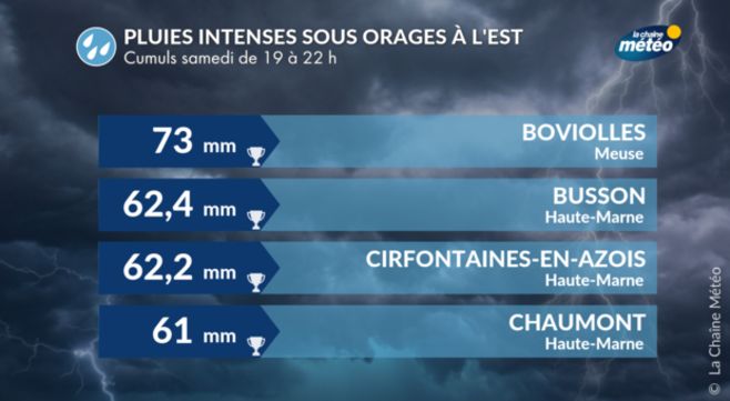 À 22 h30, la situation est toujours aussi préoccupante dans l'est, de la Meuse à la Haute-Marne où les pluies torrentielles se poursuivent. Des records quotidiens de pluie pour un mois de juin ont d'ailleurs été battus. Ces pluies provoquent la réaction de quelques cours d'eau. Des inondations sont signalées sur le centre du département de la Meuse.