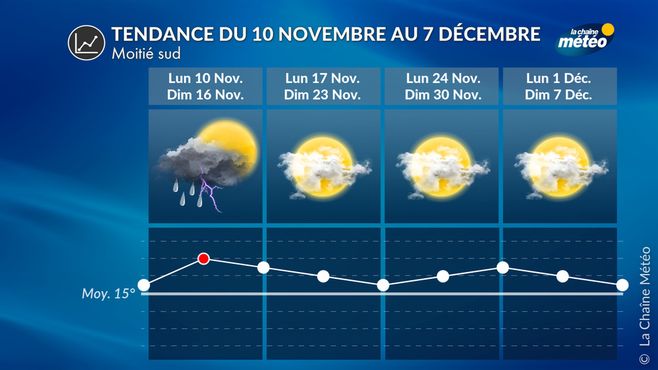 Les conditions météo devraient rester douces pour l'ensemble du mois de novembre, sans signal de froid ou d'intempéries majeures à ce jour. Si la semaine prochaine (du 11 novembre) s'annonce assez perturbée, la suite du mois pourrait se montrer plus calme.