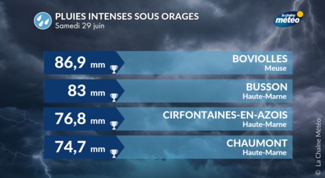 C'est dans le Tarn, dans la Meuse et en Haute-Marne que les orages ont été les plus pluvieux. Il est tombé en l'espace de 6 heures l'équivalent d'1 mois de précipitations sur certains secteurs de ces départements. Des records quotidiens de pluie pour un mois de juin ont été enregistrés.