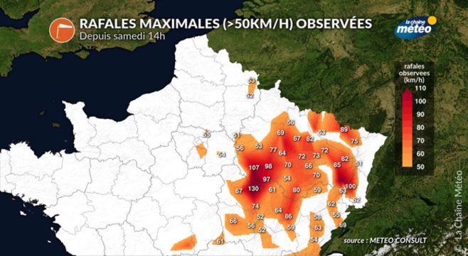 Au passage des violents orages dans l'est hier soir, de puissantes rafales ont été enregistrées. À Tonnerre (89), un record absolu de vent a été enregistré à la station.