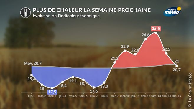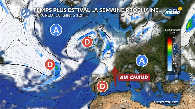 La situation météo devrait radicalement changer la semaine prochaine. Un anticyclone va s'installer sur l'Europe Centrale tandis qu'une dépression sera installée sur la péninsule ibérique. Cette dernière fera remonter de l'air chaud sur la partie sud et est de la France tandis que le nord-ouest du pays resterait sous l'influence d'un air océanique plus tempéré en provenance de l'Atlantique. On retrouverait donc un soleil souvent généreux dans le sud et l'est alors que des débordements nuageux réussiraient à s'infiltrer sur une petite moitié nord-ouest de la France. Les températures pourraient être contrastées avec des valeurs de saison au nord-ouest (20 à 26°C) mais au-dessus des normales dans l'est et le sud avec 27 à 35°C.