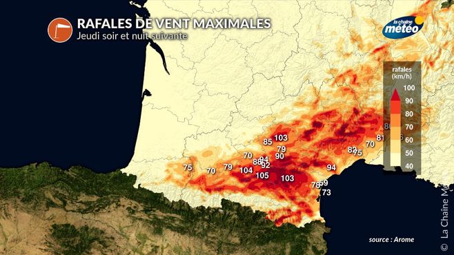 A l’avant du front se développent des cellules orageuses parfois virulentes ce jeudi soir puis la nuit suivante. Les premières prennent naissance sur les Pyrénées puis remontent en direction du Massif central. Ces orages pourront être très pluvieux avec des intensités jusqu’à 40 mm/h. Le risque de grêle est également élevé du piémont Pyrénéen à la Haute-Loire. Attention également, si vous vous trouvez en camping, de violentes rafales à plus de 100 km/h sont possibles sous les cellules les plus violentes. La période la plus critique au sud-ouest est attendue de 20h à 00h puis ces orages se décaleront en seconde partie de nuit vers les Alpes.