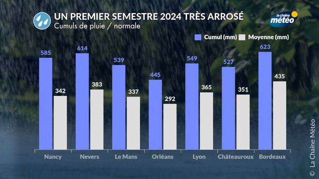 Sur le premier semestre 2024 (janvier à juin), les précipitations sont excédentaires de 35% en moyenne en France. Plusieurs régions de plaine peu habituées aux excès d'eau ont subi des pluies à répétition qui ont durablement gorgé les sols en eau. Les excédents pluviométriques les plus importants ont été observés dans les plaines du centre-ouest et du nord de la France : +38% pour Lille et Paris, +43% à Bordeaux et Clermont-Ferrand, +50% à Poitiers, Châteauroux et Lyon, +60% au Mans et à Orléans et même +71% à Nancy. Le printemps 2024 se situe au 4ème rang des plus pluvieux depuis 2024.