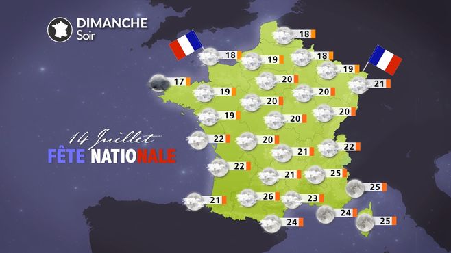 Feux d'artifice : le temps est calme et très doux partout. La chaleur est marquée sur la moitié sud avec des températures en hausse par rapport à hier. Les vents sont faibles sur toute la France pour les feux d'artifice. La soirée et la nuit s'annoncent agréables pour les bals et différents concerts en extérieur, avant l'arrivée des pluies par la pointe bretonne à partir 2h du matin, puis des orages pour la journée de lundi