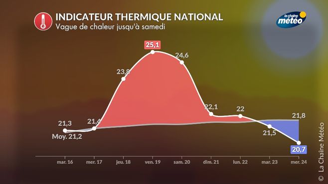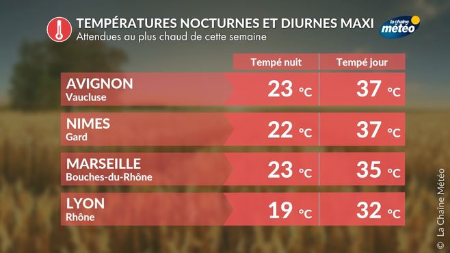 Les températures étaient déjà très élevées la semaine dernière avec 35 à 37°C dans l'intérieur du Var. Le thermomètre repart à la hausse à partir de mercredi avec une extension des très fortes chaleurs (supérieures à 35°C) au sud de Lyon. Dans ce contexte, les températures maximales (diurnes) atteindront les seuils officiels de canicule, pendant 3 à 4 jours (surtout de jeudi à samedi). Une canicule se définit aussi par des températures minimales restant élevées. Ces seuils sont proches de 22 à 23°C la nuit sur ces départements, et de 36°C en journée. Le seuil des températures maximales sera donc atteint, tandis qu'on sera très proche des seuils nocturnes. Dans ces conditions, quelques départements du quart sud-est pourraient entrer dans les critères de définition d'une canicule de jeudi à samedi, ce qui sera à confirmer.