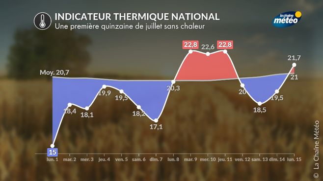 L'anticyclone n'aura pas réussi à s'installer sur la France en cette première quinzaine du mois de juillet, une situation déjà rencontrée au cours des derniers mois avec la présence de gouttes froides venant apporter un temps régulièrement instable avec des averses et des orages. Le manque d'ensoleillement a été important sur les régions de l'ouest et du nord et les températures s'en sont ressenties avec peu de jours de chaleur si l'on excepte une courte période de températures estivales du 9 au 11 juillet.