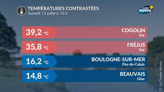 Certains après-midi de ce début de mois de juillet, le contraste de températures a atteint une vingtaine de degrés entre le nord-ouest et le sud-est, comme le 13 juillet où l'on a relevé à 16 heures 14,8°C à Beauvais dans l'Oise alors que la température atteignait 39,2°C à Cogolin dans le Var.