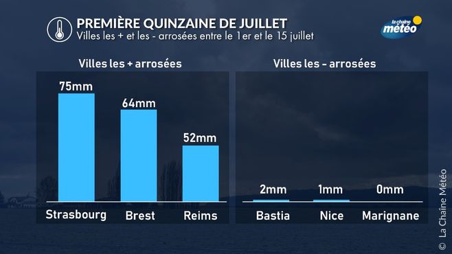 Les villes les plus et les moins arrosées en première quinzaine de juillet © La Chaine Météo
