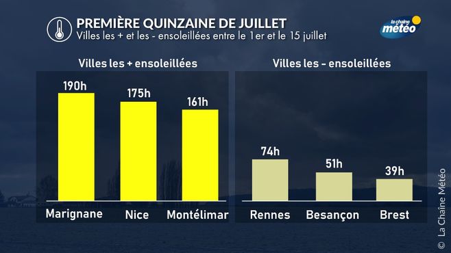 Cette première quinzaine du mois de juillet aura manqué de soleil du fait de l'absence de conditions anticycloniques et de la présence d'une masse d'air humide venant de l'Atlantique. Seules les régions méditerranéennes s'en sont bien tirées car les masses d'air se sont asséchées en passant par-dessus les reliefs du sud de la France. Résultat, le soleil a brillé près de cinq fois plus à Marseille qu'à Brest !