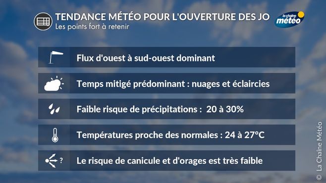 Pour la cérémonie d'ouverture des JO le 26 juillet qui commencera à 19 h 30 le long de la Seine, le temps sera plutôt mitigé sous l'influence d'un flux d'ouest à sud-ouest océanique. Dans ce type de régime dit de « dégradé nord-sud », le ciel serait changeant avec une alternance d'éclaircies et de passages nuageux. Le risque de précipitations apparait faible à ce jour, autour de 20-30%. Côté températures, elles seraient proches des normales de saison. La plupart des scénarios météo optent pour une fourchette comprise entre 23 et 26°C à Paris dans l'après-midi du 26 juillet. Pendant la cérémonie, en cours de soirée, les températures avoisineront les 20°C, ce qui sera très agréable. On éviterait donc les fortes chaleurs pour ce début des Jeux Olympiques de Paris 2024. Le risque d'intempéries apparaît très limité à ce jour en l'absence d'un contexte météo favorable aux orages ou au vent fort. La fiabilité de la prévision est de l'ordre de 70% à 7 jours du début de la compétition.