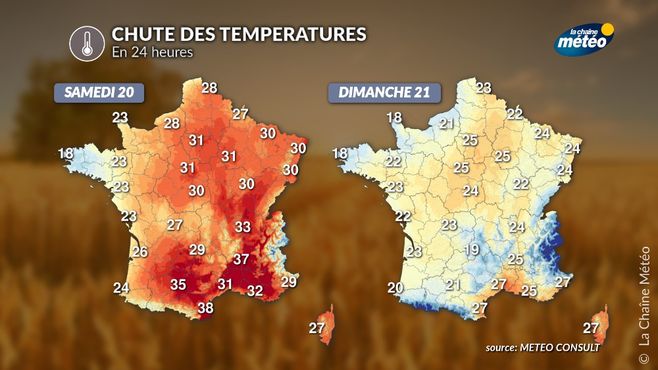 Les températures maximales, en chute de 5 à 10°C par rapport à samedi, s'échelonnent de 18 à 22°C sur les régions atlantiques à 25°C dans l'est jusqu'à 30°C entre la côte d'Azur et la Corse.