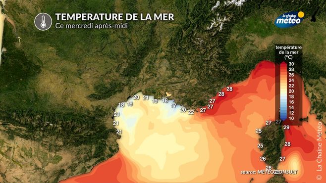 Une autre conséquence du renforcement du vent est la chute de la température de la mer. C’est le phénomène d’upwelling qui repousse les eaux « chaudes » vers le large. Les eaux plus « froides » remontent alors des fonds marins vers la surface, le long de la côte. Ainsi, l’eau autour du golfe du Lion passe de 24°C le week-end dernier à 19-20°C seulement en ce début de semaine. Il faudra se méfier du risque d’hydrocution, en raison de la différence de température entre l’air chaud et la mer fraîche.