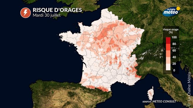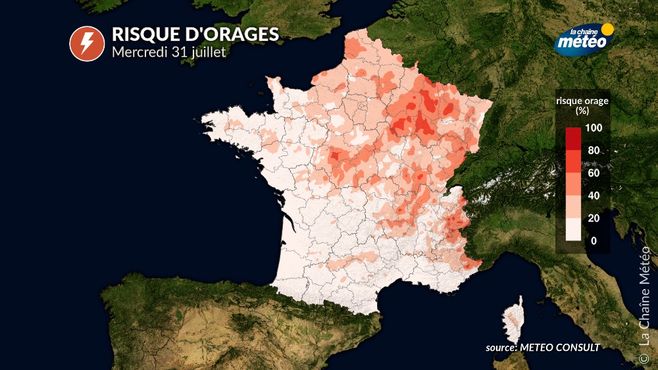 Le risque de forts orages se décale vers l'est et les régions au nord de la Seine principalement. Ces orages demeurent isolés. Mais, en raison de la forte chaleur accumulée en journée, ces orages peuvent être ponctuellement forts et accompagnés d'un risque de grêle local