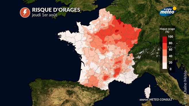 Avec l'arrivée d'air plus frais atlantique et la résistant de l'air très chaud saharien, le conflit de masses d'air s'annonce maximal sur les régions s'étendant des Pyrénées aux frontières de l'est. Ces orages seront moins généralisés que ceux de mardi et mercredi, et ponctuellement très pluvieux. Le risque de grêle restera marqué.