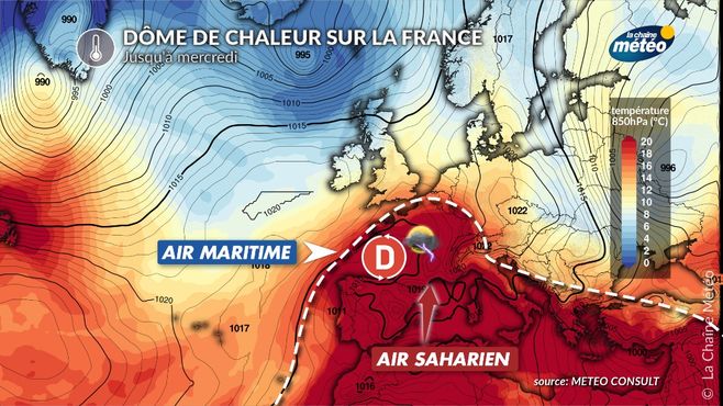 Le dôme de chaleur qui recouvre la France en ce début de semaine et provoque une canicule sur de nombreuses régions aura tendance à être bousculé par l'ouest en raison de l'arrivée d'air maritime. Cette situation donnera naissance à une dépression thermique. Cette dernière sera à l'origine d'orages isolés, ponctuellement forts et accompagnés d'un risque de grêle.