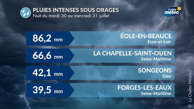 Bilan des orages du mardi 30 juillet : 1 mois et demi de pluie en Beauce et 116 km/h de vent en Normandie