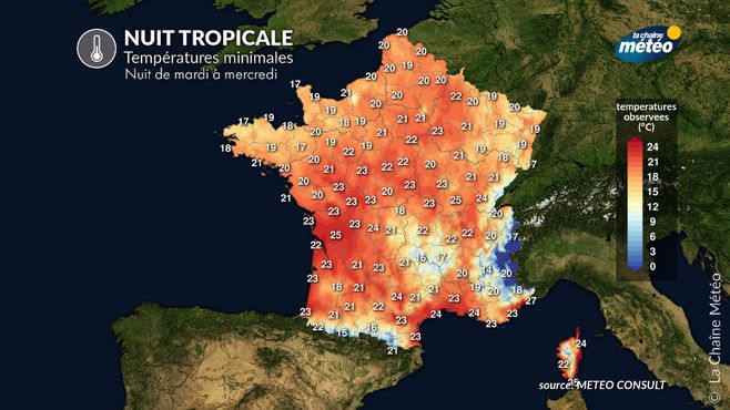 Cette nuit de mercredi à jeudi s'annonce encore tropicale sur les plaines du sud-ouest, le Bassin parisien, les plaines et vallées du centre-est et du sud-est. Ailleurs, les températures seront plus supportables avec des valeurs entre 15 et 19°C. Cette nuit tropicale sera la dernière à l'échelle nationale, permettant à la canicule de régresser progressivement en cours de journée de ce jeudi.