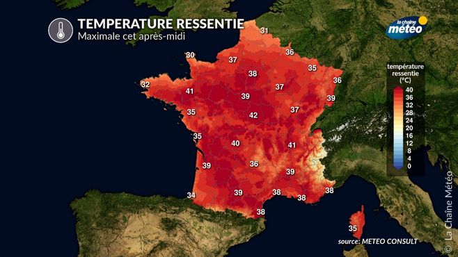 Avec l'établissement du vent d'ouest sur les régions proches de l'Atlantique, les températures amorcent une baisse appréciable avec des températures de 25 à 28°C sur le littoral et de 29 à 32°C dans les terres du pays nantais au Bordelais. L'alerte régresse au niveau jaune pour la Gironde et les Landes puisque les seuils de canicule ne sont plus atteints. Sur une large moitié sud, les très fortes chaleurs se maintiennent avec des températures souvent comprises entre 34 et 38°C dans les terres, surtout au centre est. Au nord, le pic de très fortes chaleurs est passé avec des températures qui perdent 1 à 3°C en moyenne, bien que l'ambiance reste lourde en raison du manque d'air, du soleil et du fort taux d'humidité.