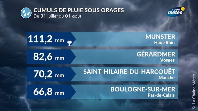 En fin de mois, après de très fortes chaleurs, de violents orages éclatent sur la partie nord de la France. Il tombe localement un mois et demi de pluie en Beauce dans la soirée du 30 juillet avec des rafales à 100 km/h à Romorantin. En Alsace, on relève 110 mm en deux heures seulement à Munster sur les contreforts des Vosges. Des inondations s'y produisent ainsi que dans la région de Gérardmer.