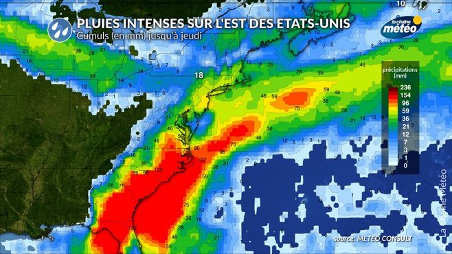 Tempête Debby : cumul des pluies sur l'est des Etats-Unis jusqu'à jeudi © la chaîne météo