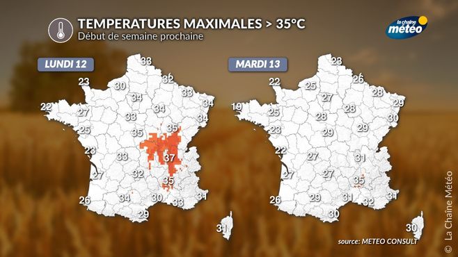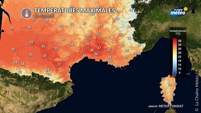 Même si ce ne sera pas encore la canicule à proprement dit, il fera encore très chaud, dans le sud, notamment en direction de la Méditerranée avec des pointes à localement 36-37°C comme les jours précédents, dans la basse vallée du Rhône, ainsi que dans l'arrière-pays provençal. Ailleurs, dans le bassin de la Garonne, les températures monteront aussi d'un cran par rapport à la veille, avec 35°C à Toulouse et Agen.