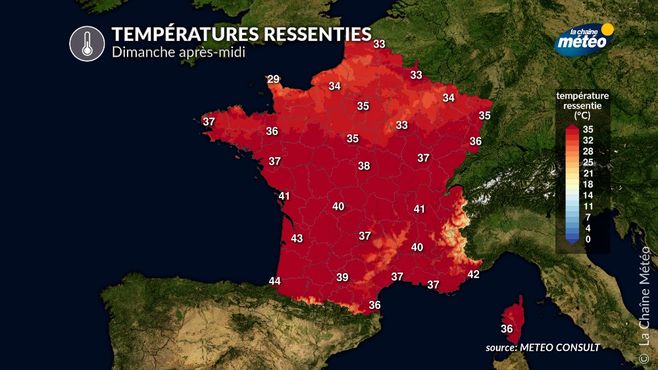 Les températures s'échelonneront de 30°C en bord de Manche avec la levée du vent de terre à 35 à 38°C sur les ¾ du pays avec des pointes vers 40°C en Aquitaine. En plein soleil, le ressenti dépassera parfois 40°