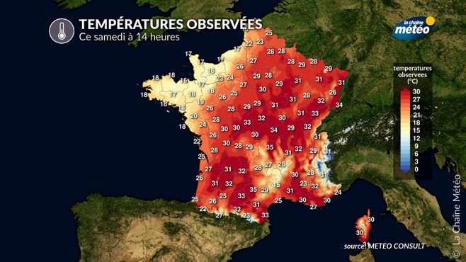 À 14 h 30, à l'avant de la perturbation, la chaleur s'accentue sur les 3/4 du pays. Les 30°C sont dépassés de l'Occitanie à Rhône-Alpes jusqu'au Grand Est avec 32 à Lyon, 33°C à Toulouse et 34°C à Mulhouse. Le ressenti atteint 40° à Toulouse, Bergerac, Châteauroux, Vichy, Colmar et 36° à Paris.