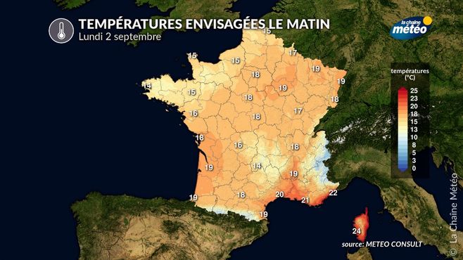 Températures minimales envisagées lundi 2 septembre © la chaîne météo