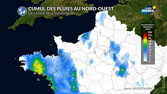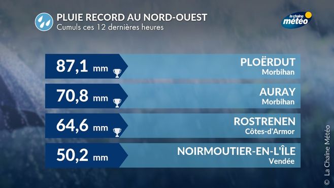 Le département du Morbihan a été le plus impacté. À Ploërdut (56) il est tombé 87,1 mm d'eau entre samedi 23 h et ce dimanche 9 h. Il s'agit d'un record quotidien de pluie absolu enregistré pour la ville. A Auray (56), avec 70,8 mm d'eau, il s'agit là aussi d'un record quotidien absolu de pluie enregistré pour cette ville.