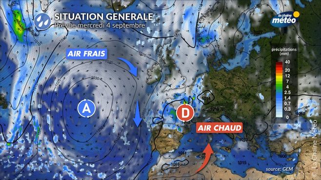 Situation générale prévue pour le mercredi 4 septembre, modèle Canadien GEM © La chaine Météo