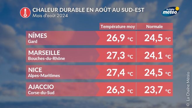 L’été 2024 a fini avec environ 1,5°C d’excédent thermique autour de la Méditerranée avec des chaleurs, certes non exceptionnelles, mais durables. Nîmes, Ajaccio ou encore Nice enregistrent leur second mois d’août le plus chaud depuis le début des relevés avec respectivement +2,7°C, +2,6°C et +2,9°C par rapport aux normales. Si l'on regarde à l'échelle régionale, la région Provence-Alpes-Côte-d-Azur a connu son sixième été le plus chaud depuis 1947.