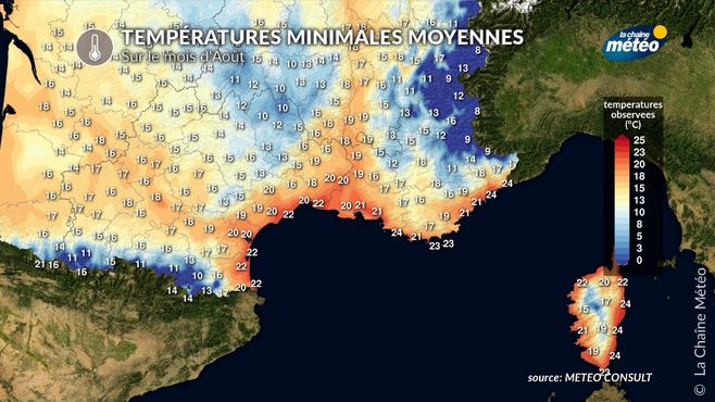 À Nice, la température nocturne n’est pas descendue en dessous de 20°C depuis le 6 juillet, ce qui fait au total 57 nuits tropicales dont 15 nuits au-dessus de 25°C. La ville de Marseille a connu, ce mois d’août, 27 nuits tropicales dont 3 au-dessus de 25°C et Ajaccio a enregistré 22 nuits tropicales.