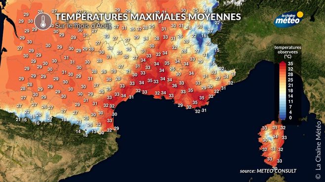 Les températures maximales étaient également très élevées sur la durée avec des valeurs souvent supérieures au seuil de fortes chaleurs (30°C), même sur des villes littorales. À Nice, 18 journées au total, ont connu une température maximale supérieure à 30°C avec une pointe à 35,3°C le 12 août. Enfin, Nîmes n’a connu que 4 journées en dessous de ce seuil avec 9 journées au-dessus de 35°C, dont un maximum à 39,2°C le 1er août.