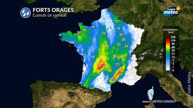 Une goutte froide se positionne ce samedi dans le golfe de Gascogne. Elle fait remonter de l’air chaud à l’avant avec, par exemple, 26°C attendus à Lille, 29°C à Strasbourg et 33°C à Ajaccio. Un conflit de masse d’air se met en place avec l’arrivée de la goutte froide plus à l’ouest. Des orages commenceront alors à éclater en début d’après-midi sur le Limousin puis un axe orageux devrait se former du midi toulousain au Massif central. Ces orages seront localement violents avec un risque de grêle et de fortes rafales. Des cumuls de 20 à 50 mm seront possibles en l’espace de quelques heures. Ces orages se décaleront ensuite en direction du centre-est. D'autres orages remonteront également jusqu'au bassin parisien et au Grand-Est la nuit suivante.