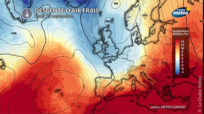 Les températures repasseront nettement en dessous des normales de saison mercredi et vendredi prochain. Un front froid actif pourrait balayer la France du nord-ouest vers la Méditerranée avec des pluies soutenues, de la neige à moyenne altitude sur nos montagnes. À l'arrière du front, le temps devrait rester instable avec des averses en plaine et des giboulées en montagne. La neige pourrait blanchir les sols dès 1800 m, ce qui survient précocement, mais n'a rien d'exceptionnel pour un mois de septembre.