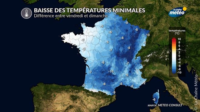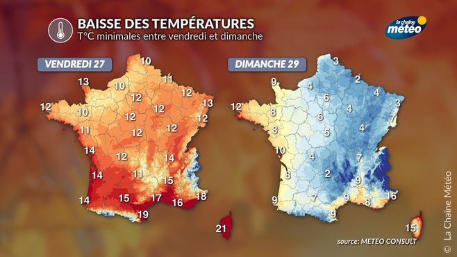 La chute sera d'autant plus grande en allant vers l'est, où l'influence continentale sera prépondérante. Sur l'ouest, et particulièrement en Bretagne, les températures resteront douces le matin avec l'influence océanique.