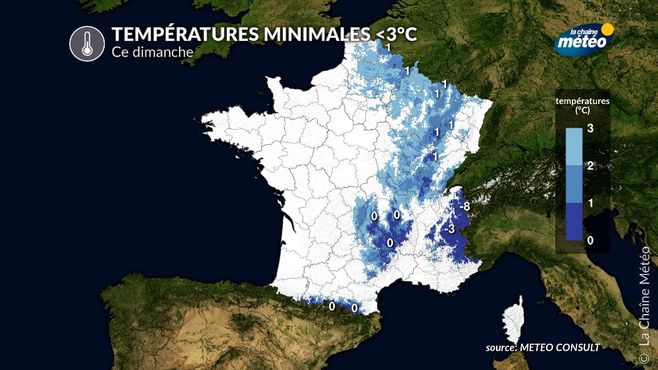 C'est dimanche matin que les températures seront les plus basses, puisque le ciel sera majoritairement dégagé durant la nuit précédente. Avec un ciel dégagé et la diminution du vent, le rayonnement nocturne infrarouge sera favorisé, notamment dans les fonds de vallée et les campagnes, où le thermomètre pourra chuter plus facilement.