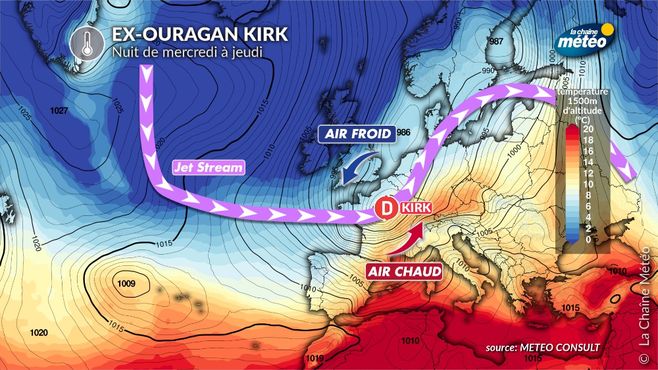 En effet, Kirk va remonter avec de l'air chaud à l'avant (flux de sud-ouest), puis de l'air froid s'engouffrera vers la Bretagne en s'enroulant autour de la dépression. Ce choc thermique risque alors de renforcer le dynamisme de cette dépression, qui pourrait se creuser encore davantage en remontant vers le nord-est de la France. C'est aussi cette situation qui explique que les rafales pourraient être aussi fortes de l'Atlantique au nord-est, ce qui est atypique.