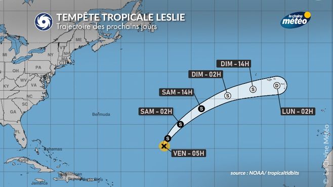 Leslie est née en début de semaine dans le sillage de Kirk. Sa progression est lente et erratique. Mais maintenant, elle semble incurver sa trajectoire vers le nord-est, vers les Açores. Cet archipel a l'habitude d'essuyer des systèmes tropicaux à cette époque de l'année (Lorenzo et Pablo en 2019, Elsa en 2021, qui a touché aussi le Portugal continental, Gaston et Danielle en 2022).