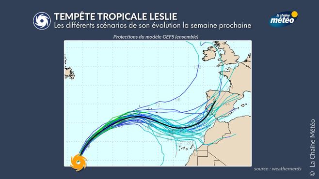 Trajectoires possibles de Leslie en direction de l'Europe © La Chaine Météo