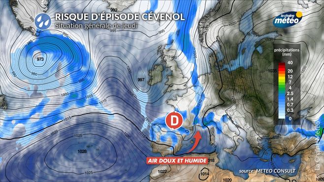 Cependant, cette grande douceur va s'accompagner d'air très humide et instable en provenance de Méditerranée, avec la conjonction de l'instabilité générée par les basses pressions. Cet air va remonter sur le golfe du Lion, puis se bloquer sur le relief cévenol, où l'on craint des cumuls importants. D'autres fortes pluies orageuses vont également concerner la partie est de la Provence, avec là aussi des cumuls significatifs.