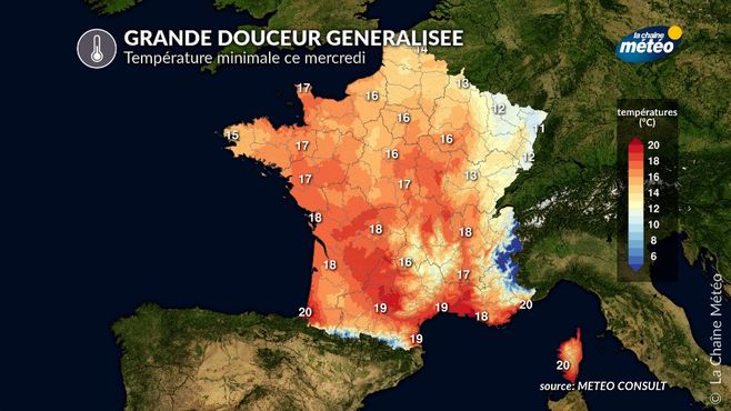 Mercredi, la masse d’air chaud en altitude sera toujours présente et la couverture nuageuse sera plus importante en matinée. Les valeurs des températures minimales seront alors exceptionnellement élevées pour la saison. Elles seront souvent plus élevées que ce que l’on peut espérer en plein milieu de l’été. On attend ainsi, 15°C à Rouen, 16°C à Paris, 17°C à Nantes, 18°C à Lyon, 19°C à Toulouse et plus de 20°C au pied des Pyrénées, en Corse et sur la Côte d’Azur. Les normales en cette saison sont comprises entre 5 et 16°C en général.