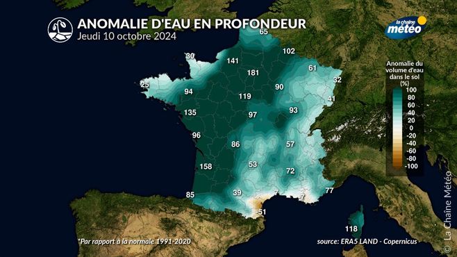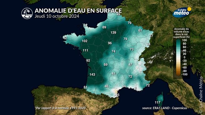 Actuellement, les sols sont saturés sur quasiment l'ensemble du pays, excepté le Roussillon. Les anomalies de teneur en eau dans les sols sont parfois à plus de 100%, ce qui démontre la singularité de la situation hydrologique actuelle.
