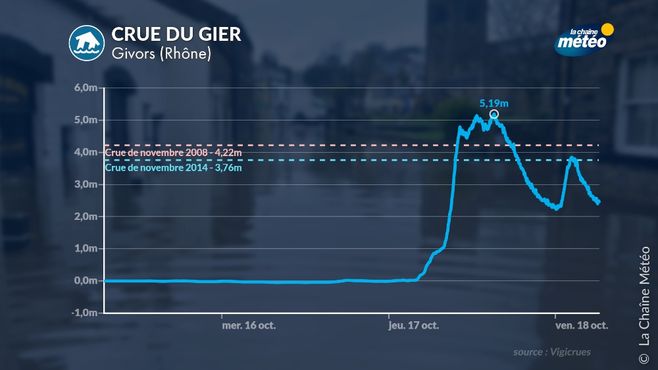 Au plus fort de son pic de crue, le Gier à Givors (Rhône) a atteint la côte de 5,19 m, dépassant largement la crue de novembre 2008 (4,22 m).