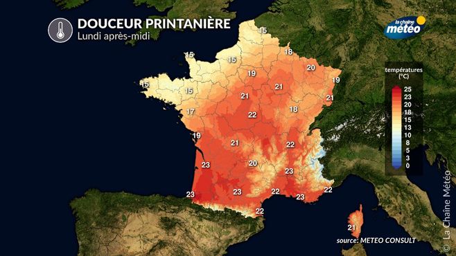 - douceur généralisée avec 20 à 25°C l'après-midi, mais seulement 15°C en Manche