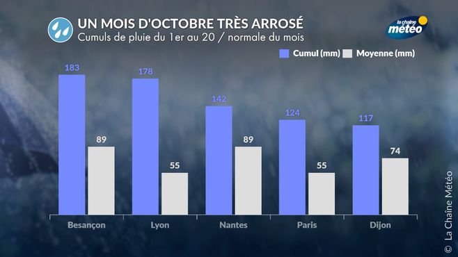 Depuis le début du mois d'octobre, la France a subi l'assaut de plusieurs perturbations actives, dopées par les restes d'anciens cyclones Kirk et Leslie. Sur l'ensemble des 20 premiers jours d'octobre, il a plu en moyenne 89 mm sur 30 villes de référence alors que la normale est de 53 mm. L'excédent pluviométrique est donc proche de 70% à l'échelle nationale avec de gros excédents sur certaines villes comme Paris (124 mm soit +246%), Lyon (178 mm soit +174%) ou Besançon (183 mm soit +152%). Les villes qui présentent un déficit pluviométrique sont très rares : -22% à Montélimar et -57% à Perpignan qui continue de subir une sécheresse hydrologique.
