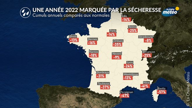 C'est notamment près de la Méditerranée que le déficit a été le plus grand, avec un cumul annuel ne dépassant parfois pas la moitié de ce qui aurait dû tomber, comme à Bastia. En conséquence de ces précipitations très faibles, l'année 2022 fut marquée par une baisse drastique du niveau des nappes et par une sécheresse agricole importante, qui s'est poursuivie au début de l'année 2023.