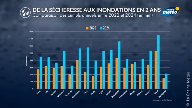 Les nappes sont à un niveau très élevé sur la plupart des régions, les agriculteurs peinent à semer, car les sols sont saturés, et les inondations sont nombreuses. Pourtant, il y a seulement deux ans, c'était tout le contraire avec une sécheresse historique en 2022. La Chaîne Météo vous propose une comparaison saisissante de ces deux années inversées.