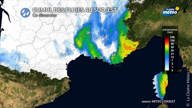 Après les fortes pluies et les orages de la nuit de samedi à dimanche, prudence si vous êtes dans le sud-est en raison des fortes pluies et des orages qui se poursuivent encore quelques heures entre les Cévennes, la Provence Côte d'Azur et la Corse. Attention aux chaussées détrempées et aux inondations ainsi qu'aux glissements de terrains toujours possibles. Des pluies vous concernent si vous êtes entre le sud de l'Aquitaine et les Pyrénées avec des chutes de neige au-dessus de 1800 mètres. En remontant vers le nord, vous avez moins de pluie et retrouvez un temps plus calme, mais brumeux.